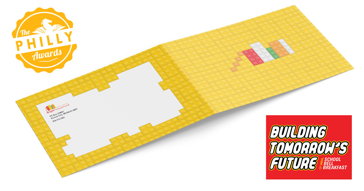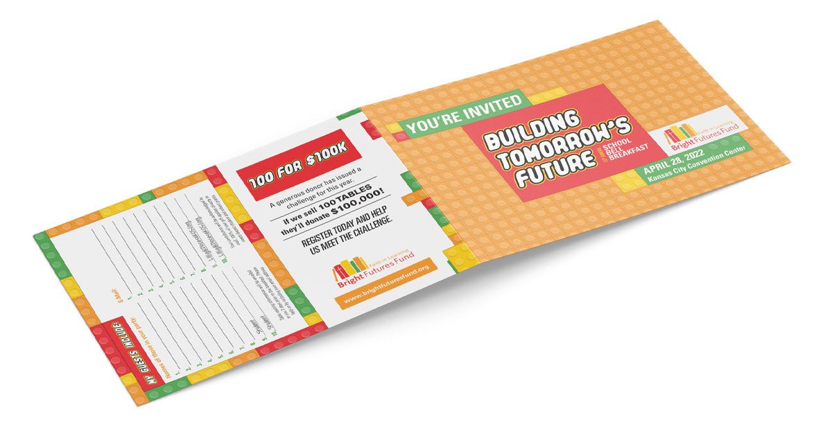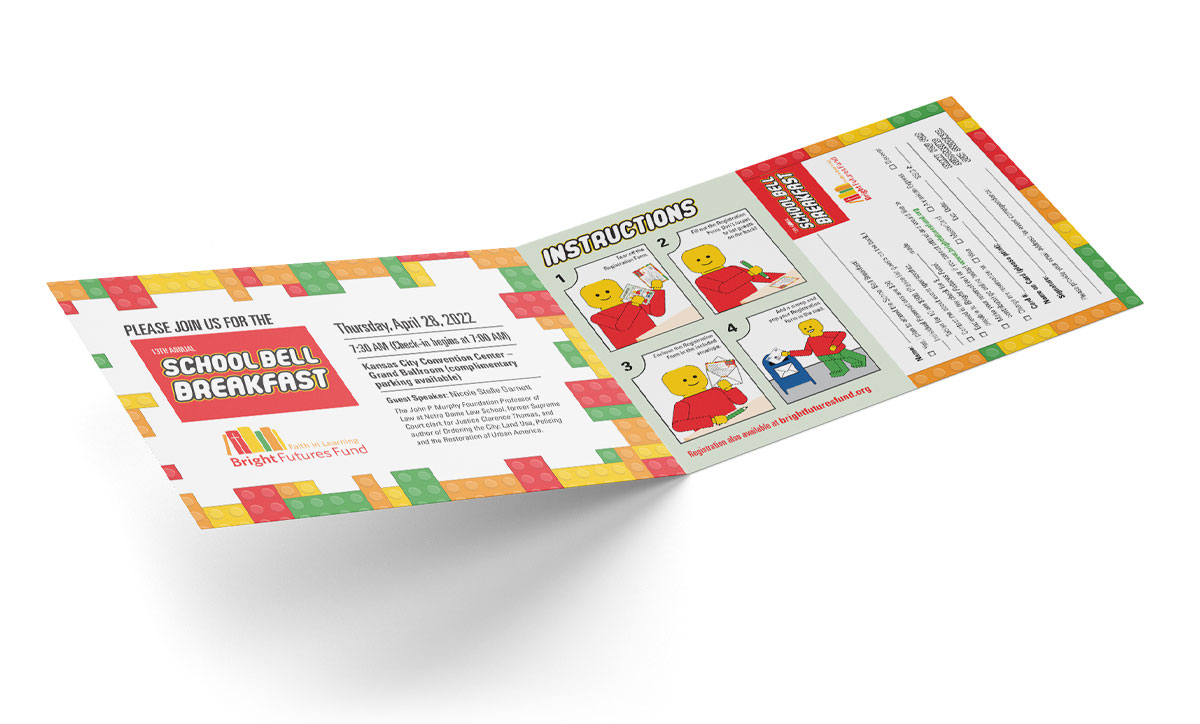 The Bright Futures Fund is an independent 501(c)3 corporation within the Diocese of Kansas City-St. Joseph and The School Bell Breakfast is the organization’s marquee fundraising event. My client came to me with an idea to do a Lego-themed invitation. He wanted to mimic Lego bricks and had an idea to do the RSVP/donation instructions in the style of Lego instructions. The piece was packaged as an outer folder on which the address would print, then an interior bifold brochure with a micro-perforated RSVP and donation card, as well as a return envelope for respondents to place their RSVP.